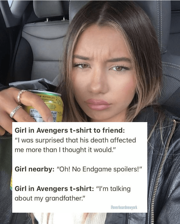 Because of her shirt, this random stranger assumed the lady was talking about the plot of the latest Avengers movie. Turns out she was talking about the passing of her grandfather, which is very much NOT a movie spoiler. We have such intense second-hand embarrassment for this person who assumed she was talking about a movie. This is why you don’t insert yourself into any conversations. Honestly, why even try to talk to anyone, ever?!