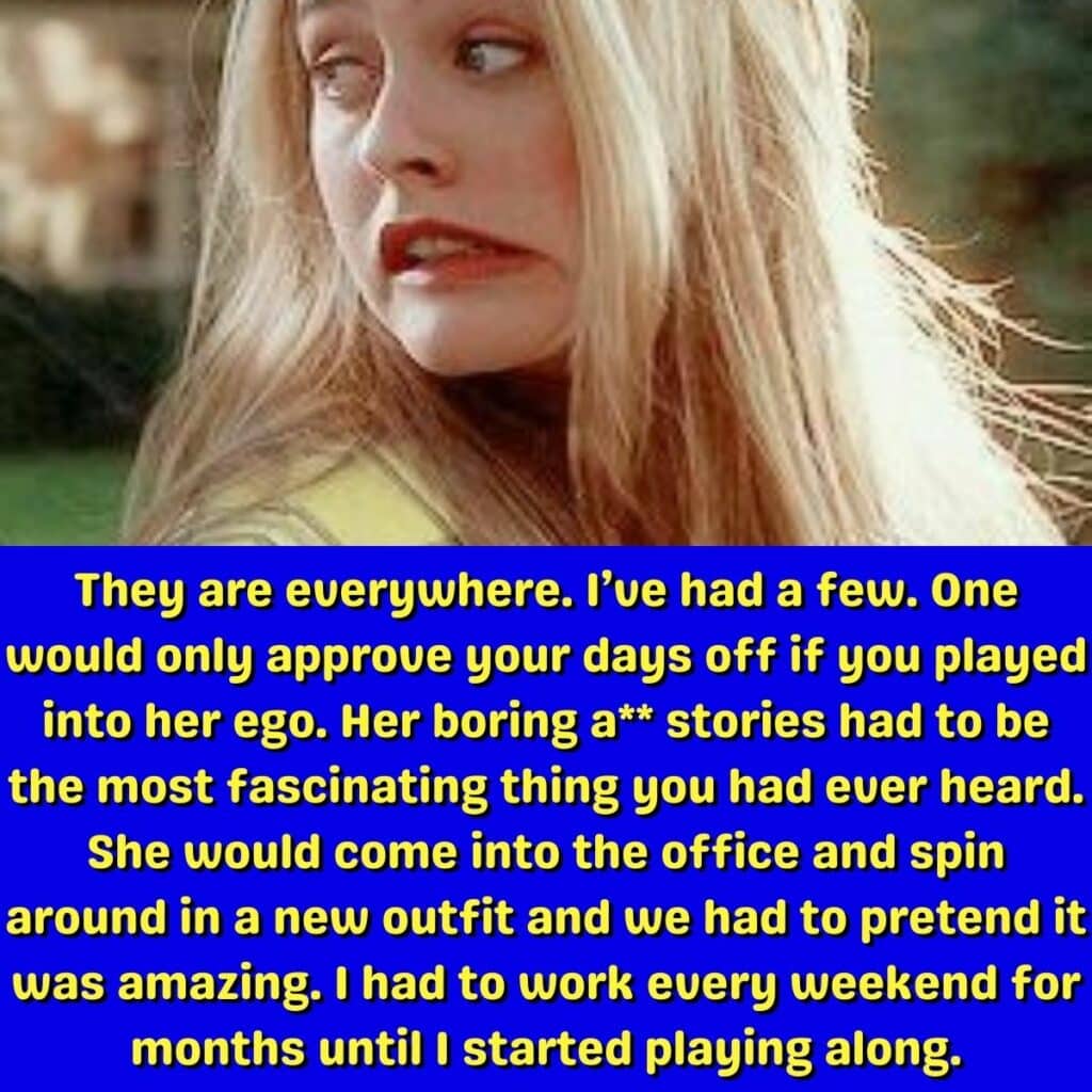 Some bosses simply want to feel like, well, a boss. This boss was addicted to flattery and compliments to the point where she’d only give time off to those who would kiss up to her. She even made this employee work weekends until they started to kiss up to her. That’s harsh and illegal!