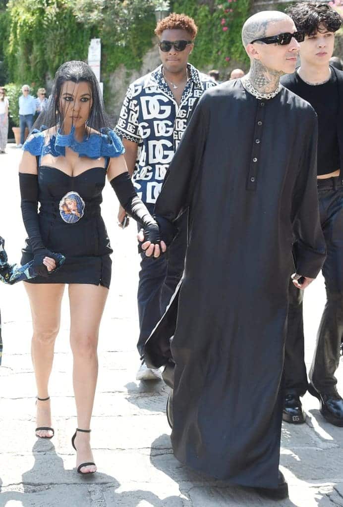 Kourtney and Travis Barker finally tied the knot in Italy in May of 2022, and whilst she wore a white dress to her ceremony, this was one of the wedding week ensembles she wore in Italy. And we have to say, that it is probably one of the strangest wedding-like dresses we have ever seen.