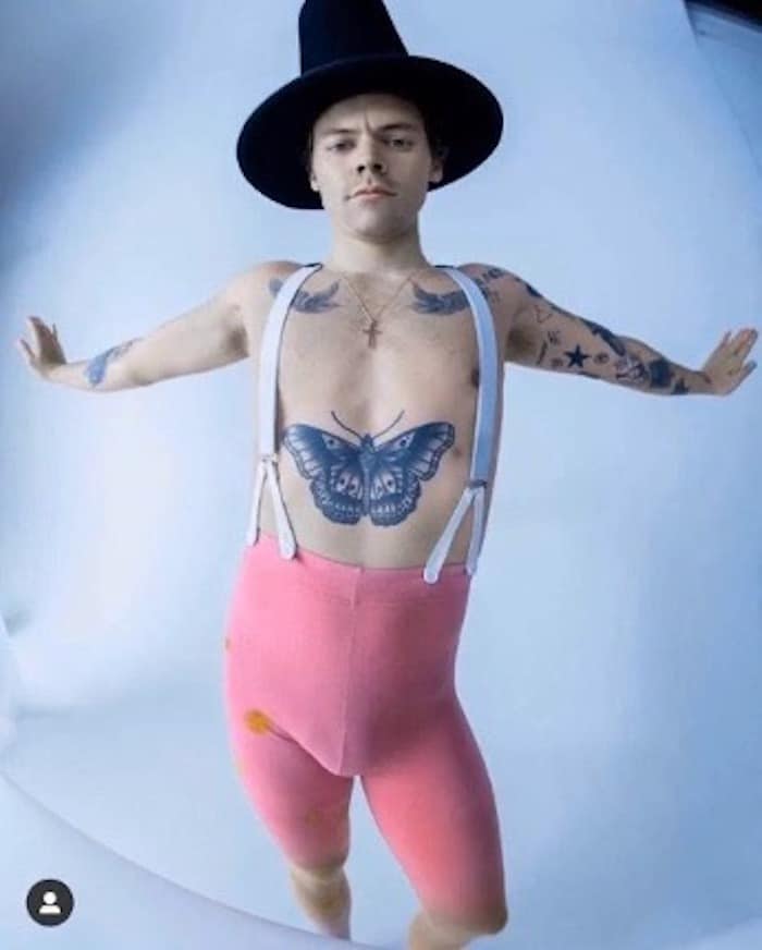 We don’t really know what he was going for in this picture with his pink bike shorts, white braces, and black Mormon-like top hat, but we are sure that the photographer and stylists of this shoot had a vision. His tattoos also definitely impact the style of the shoot…