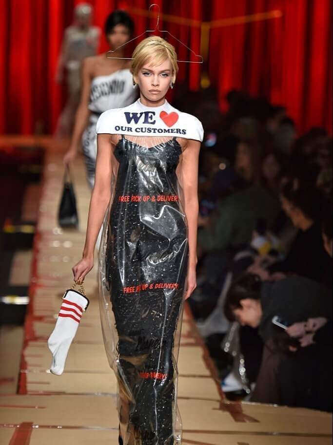 Fashion runways are full of outrageous stylings. Often, a lot of what makes its way to the stage is more art than fashion. Accordingly, this dress looks more like a goofy Halloween costume than a wearable outfit. Moschino designed this dress that looks just like a dry-cleaning bag, complete with a plastic covering and a hanger!