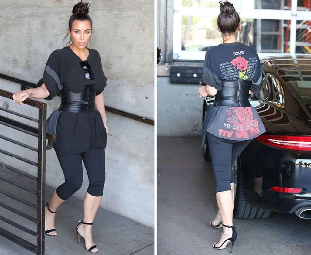 I mean, who would think of wearing a leather corset over an oversized t-shirt, paired with tights and heels? Or maybe this was a late morning, she was in a hurry, and these were the first items she was able to grab from her walk-in closet? It must be hard finding the right clothes every morning when your closet is the size of a house! It must take hours to find anything in there.