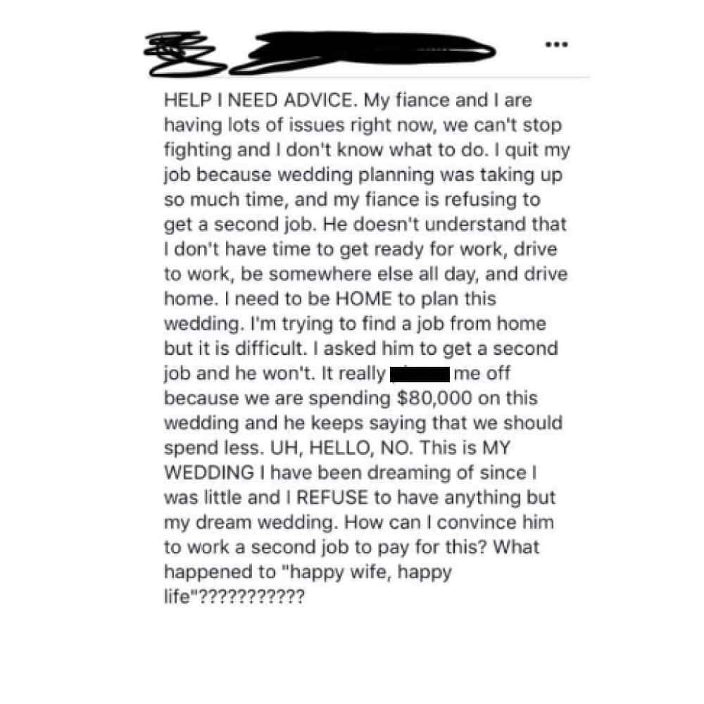 Not only did this woman quit her job to plan her wedding full time, but she expects her fiance to get a second job to pay for the big day. Instead of laying the financial burden on her fiance, maybe she should think about scaling back. Being married is about compromise and being in a partnership, which we’re not seeing here.