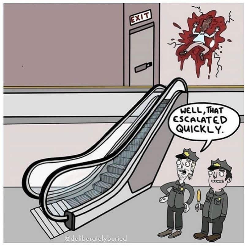 Oh dear. This feels like a strange, surreal dream for some reason. Trying to take an escalator up, and it seems to be accelerating at an alarming rate. That rider looks like he might have broken the sound barrier before going splat.