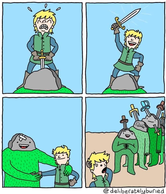 The job of a hero is never over; there is always another stone that needs the sword pulled from its head. This blond-haired hero here, we’ll call him Artan, seems like the man for the job. The other stones-with-swords are lining up en masse to have their blades pulled.