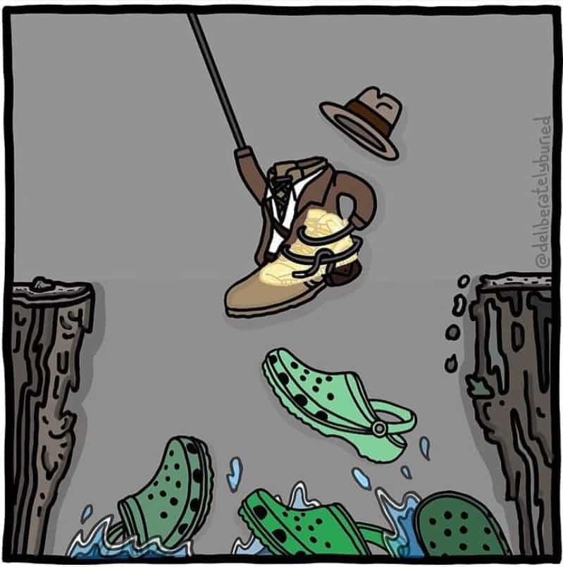 Watch out for those Crocs, Dr. Jones; they’ll damage your feet if you switch out your hiking boots and go walking in them. Boot-eating Crocs is one way to put a new spin on the adventures of our good friend Indy, and I would be afraid of Croc shoes too if I were in his… shoe.