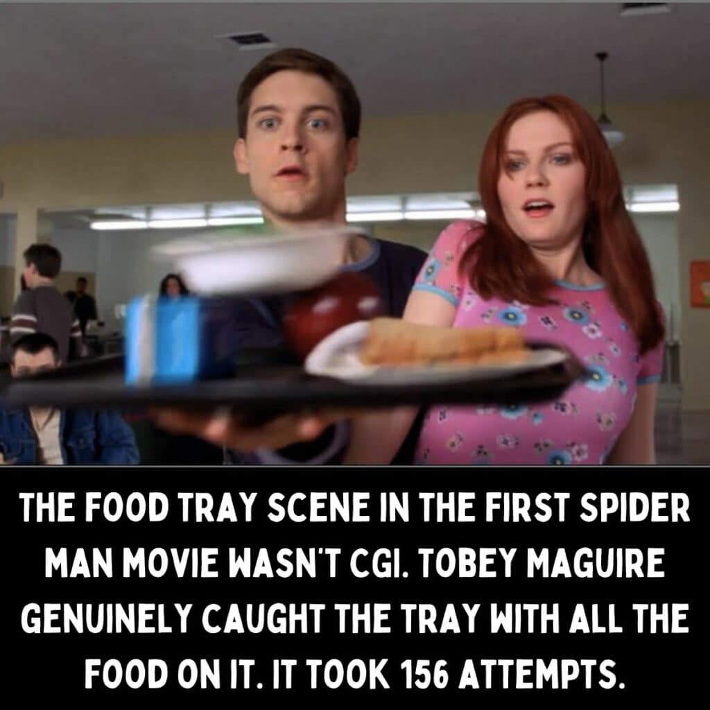 In the first Spider-Man movie, the iconic food tray scene featuring Tobey Maguire as Peter Parker wasn’t created through CGI magic. Rather, it was a remarkable display of practical effects and Maguire’s skill. To achieve the scene where Peter Parker, still coming to terms with his newfound powers, accidentally catches a tray of food before it falls, it took an astonishing 156 attempts to get it just right.