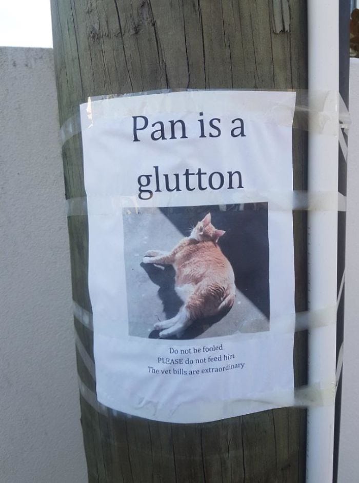 Fat shaming is wrong and unacceptable, but what about cat shaming? Pan is a glutton, and apparently, his owners think he should be ashamed about it. Some cats are very active; they like to jump around, climb on furniture and chase butterflies in the backyard, while other cats are lazy and like to sleep all day. Pan must belong to the second group.