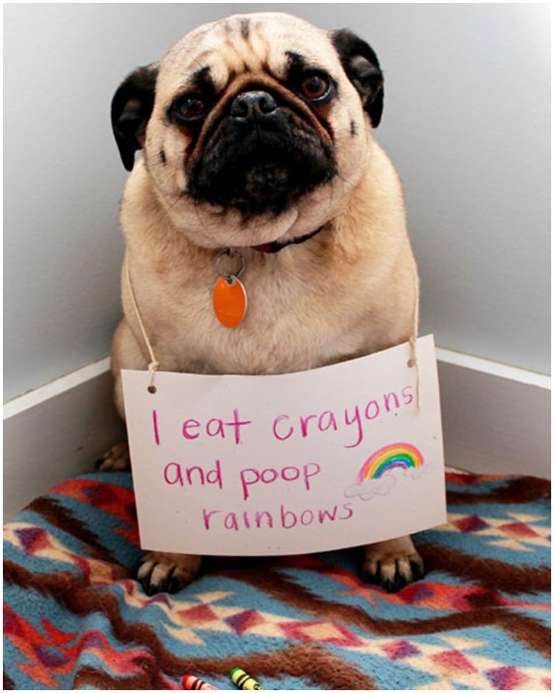 When kids try to eat crayons at school, they get a time-out, and when dogs eat crayons, apparently, they are shamed online. The obvious solution would be to hide the crayons from this mischievous Pug, who looks pretty upset at the moment.