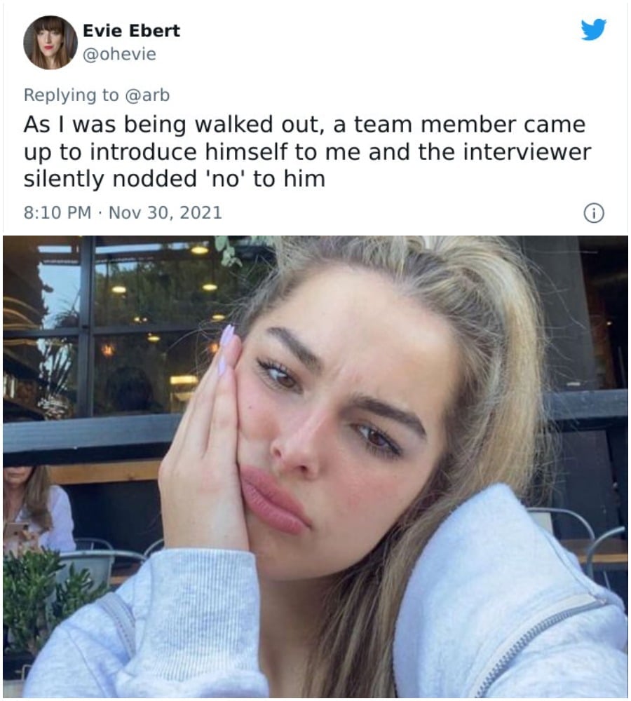 Isn’t it the worst when you think a job interview went well and the interviewer feels differently? That’s what happened to this poor lady. She had an interview that she thought went pretty well, and she was being walked out by the person who interviewed her. Another team member started to walk up to introduce himself to her, and that’s when things got cringe.