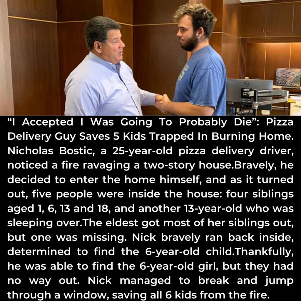 When 25-year-old Nicholas Bostic was delivering pizza, he noticed a burning home and attempted to try and save whoever was in there. Whilst he had come to terms with the potential of his death, he knew it was important to save who he could. After finding the last remaining child, he broke through a window and delivered her to safety.