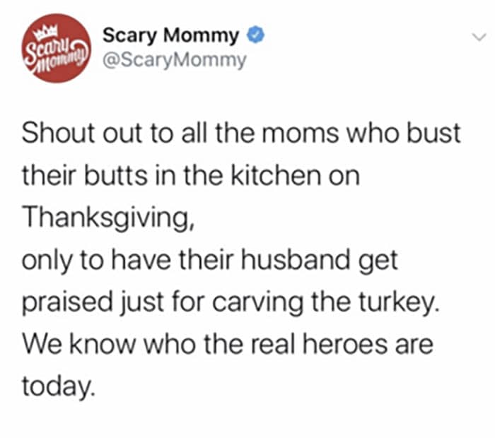 And it can be even worse on Thanksgiving, where for some reason, carving the roasted turkey is seen as a traditionally masculine task, and one that people exclaim over, for some reason. Do you know how long it takes to carve a turkey? A couple of minutes, if you’re bad at it. Do you know how long it takes to plan and shop for and execute the rest of the meal? Hours. Days. Weeks. Let’s give credit where credit is due.
