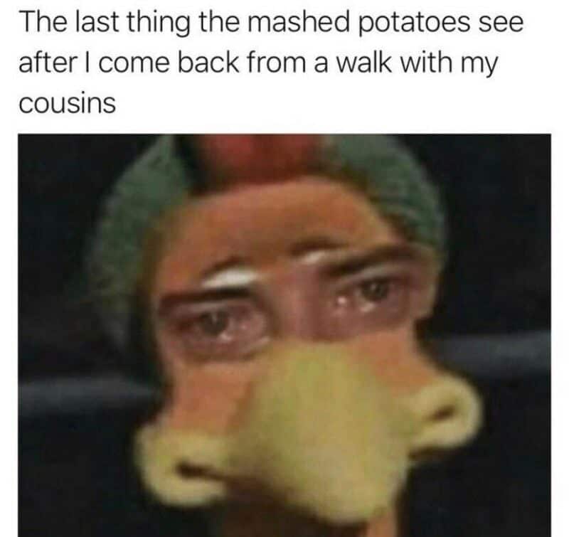 Secondly, I totally get it, though. I have already spoken at length about my deep and abiding love for mashed potatoes, so you’d better believe that if I’m getting back from a walk with my cousins and I see that there are still leftover mashed potatoes, I am definitely going to down those.