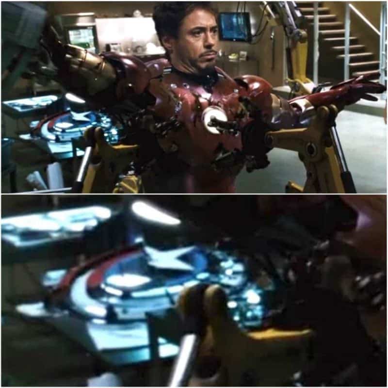 There’s a very important scene in the movie that shows Tony Stark getting dressed in the iconic Iron Man suit. If you look closely, you can make out a very important object that will actually be showing up in most future movies. The item you’re seeing is actually Captain America’s shield, or rather, half of it. At this stage of the story, we’d guess it was probably halfway through production.