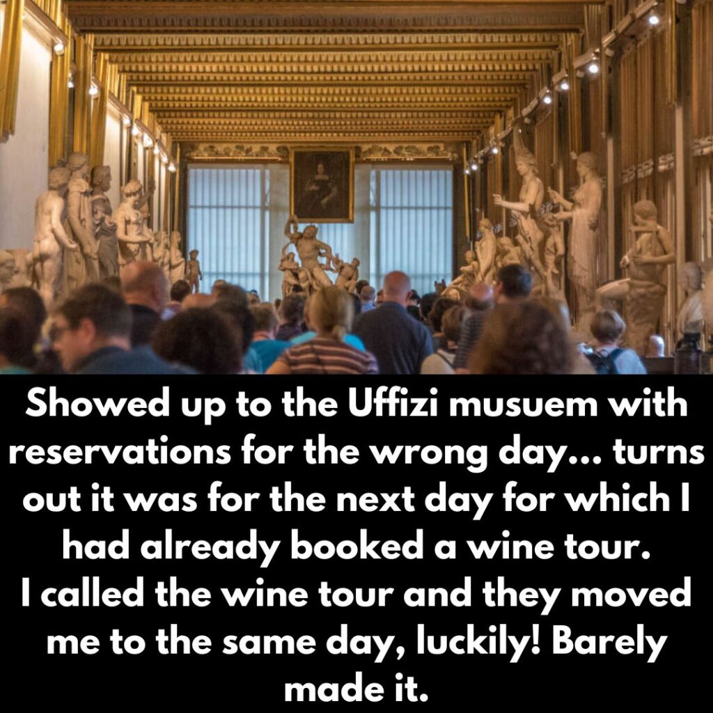 Fortunately, whoever was running the wine tour was willing to adjust it because you can’t miss out on visiting the Uffizi, now can you? Or on the wine, for that matter. For those traveling to that part of Italy, take notes so you don’t make the same mistakes!
