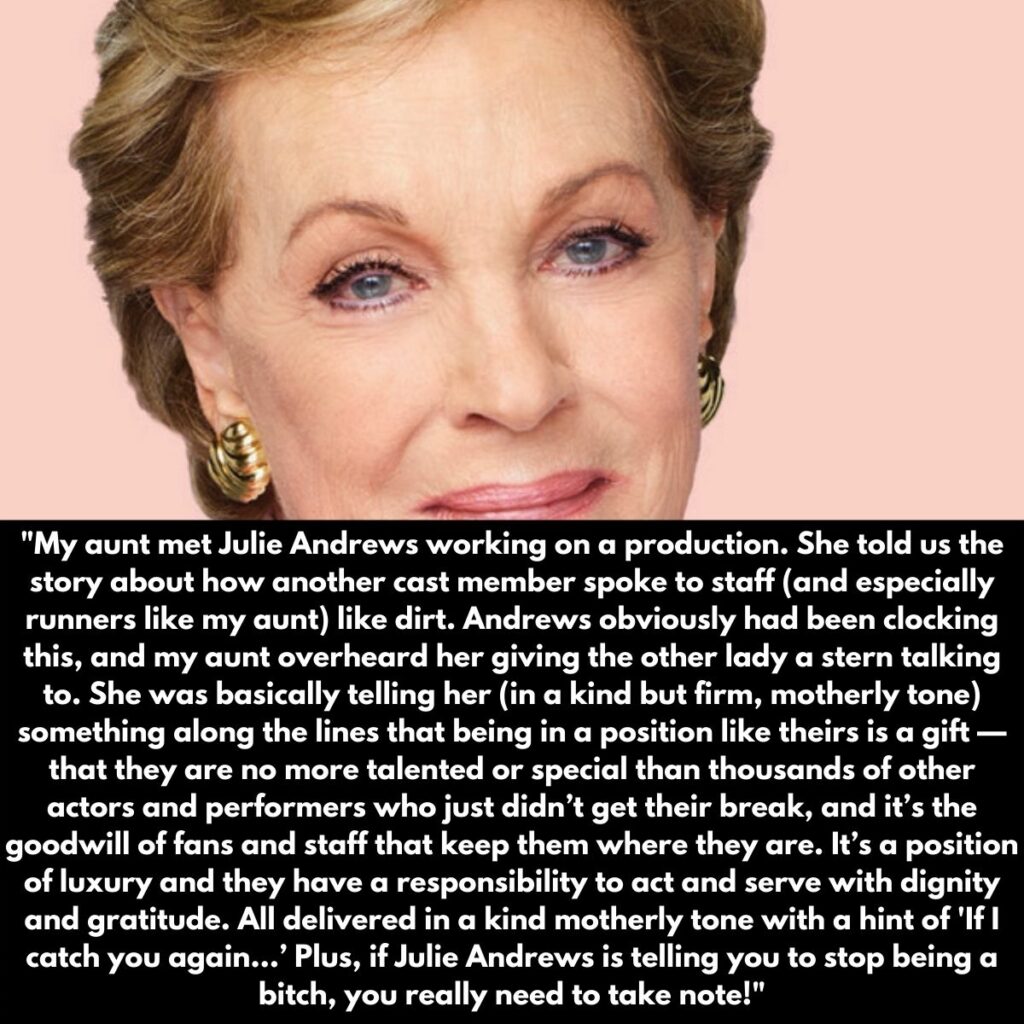 Bow down to the queen herself, Julie Andrews! I was holding my breath until the end of this story because I would absolutely lose my temper if I found out Julie Andrews was a bad person. Thankfully, she is just as gracious and wholesome as the characters she plays on TV and in movies.