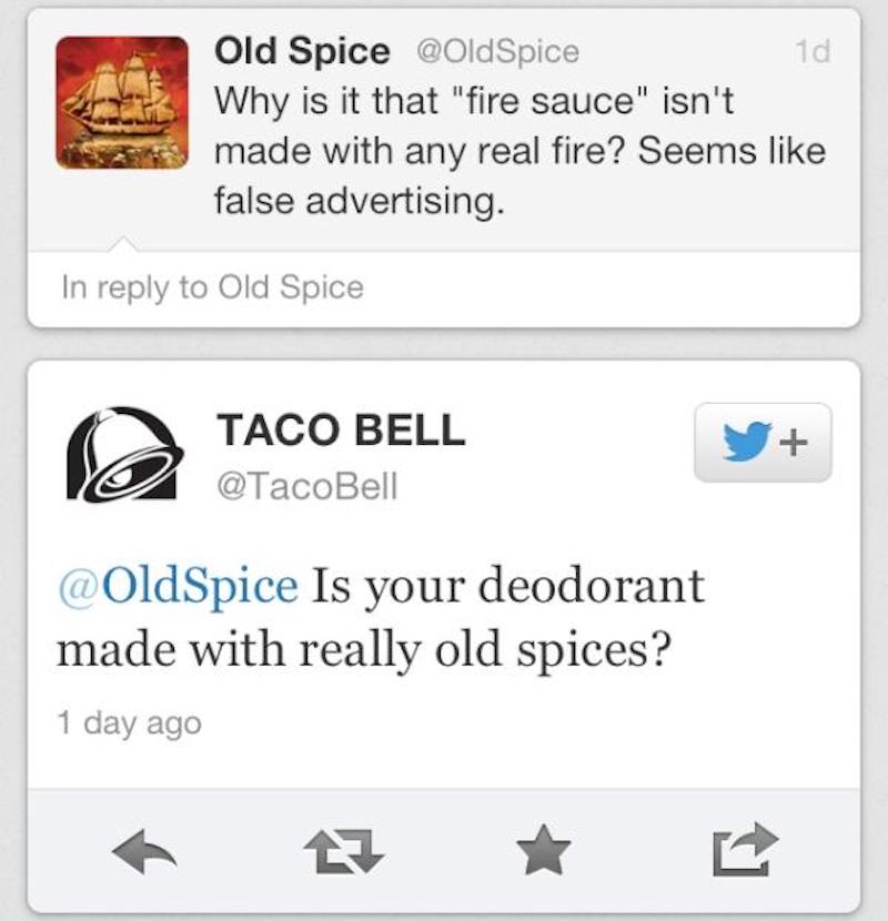 Although social media can be pretty infuriating at times, it’s also full of hilarious exchanges. Even companies are joining in on the dishing-and-receiving fun. Here, we see the beginnings of Old Spice’s infamous beef with Taco Bell that lasted all but two tweets. You shouldn’t call out companies for using buzzy-sounding words for their product descriptions since they’re not always literal, right Old Spice?
