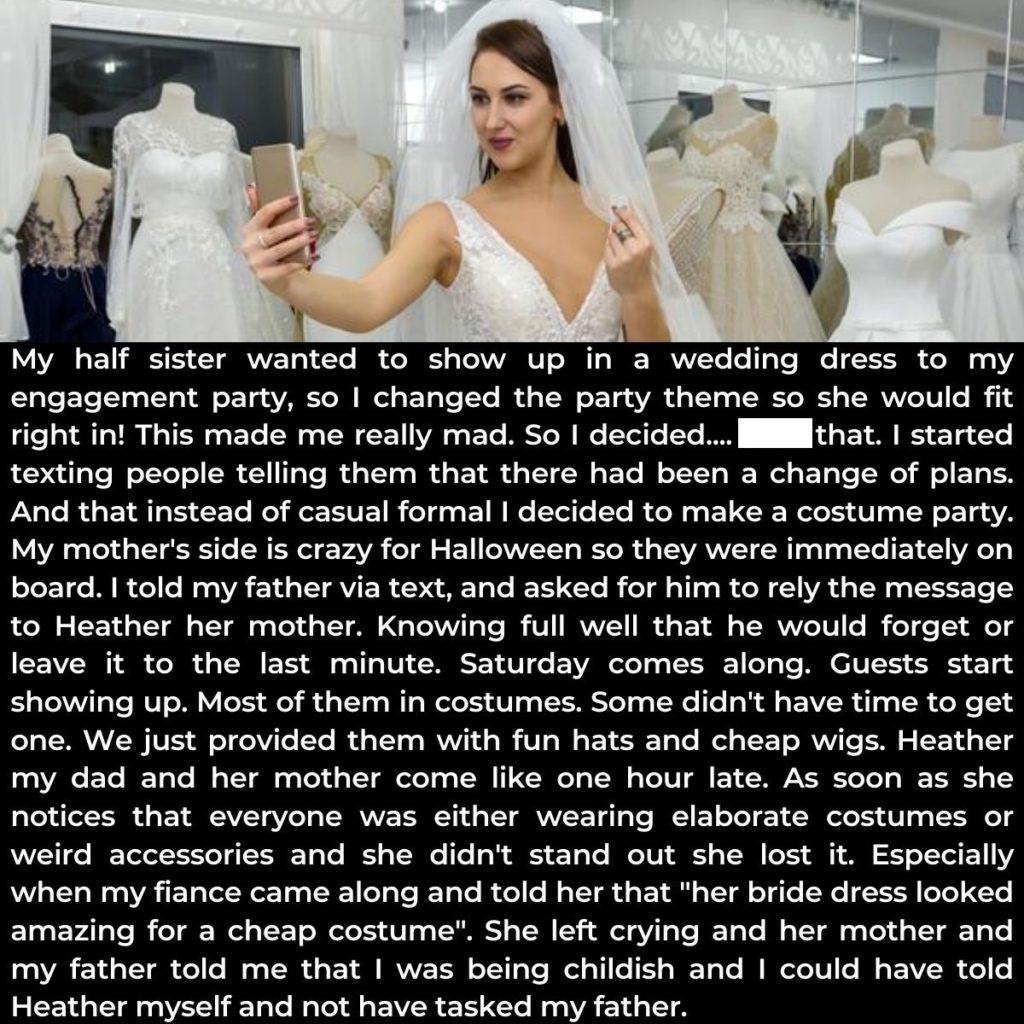 To be honest, we would probably act in the same way… In what world is it ok for someone’s half-sister to come dressed to their engagement party in a wedding dress? Sibling rivalry exists in the best of times, but for someone’s sibling to go this far surrounding a wedding that’s a little too much.