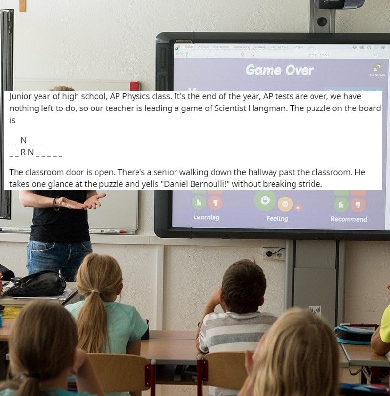 This is one of the best power moves on the list, if you ask us. In this person’s junior year of high school, in their final class of AP Physics, someone made a surprising power move. The teacher was passing the time with a friendly game of Hangman, with only three mysterious letters on the board. As the class was staring at the board cluelessly, a senior walked past the classroom, glanced at the board, and yelled “Daniel Bernoulli!” while walking.