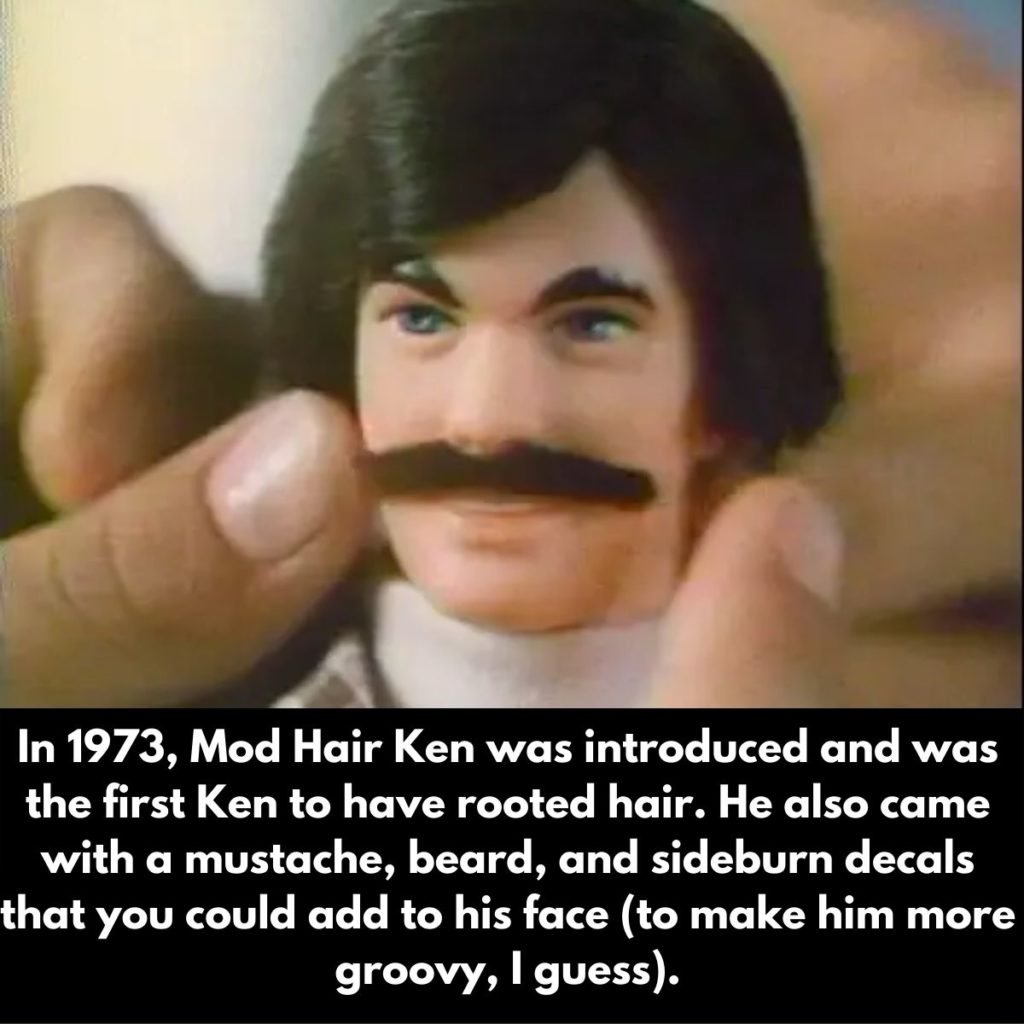 First, it had real rooted hair, and he came with stick-on facial hair to fit the times: a mustache, a beard a sideburns. We have a suggestion for a new Ken doll, if anyone in Mattel is reading this: Star-Burns Ken! A Ken doll with star-shaped star burns, inspired by Star Burns from Community.