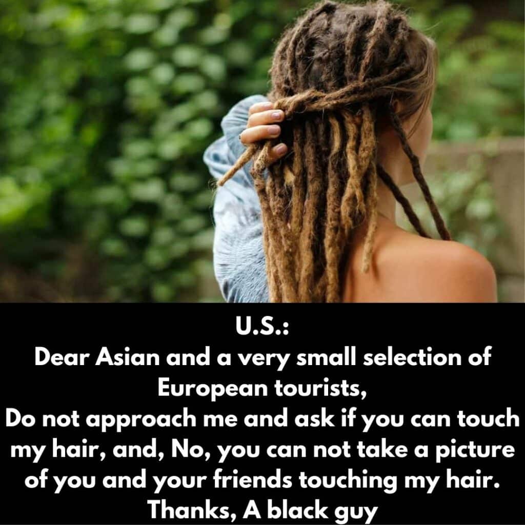 Ah, that old habit seems to continue on. People who think it’s okay to get in someone’s personal space and start touching their hair without their permission. It’s not any less weird to just walk up to a stranger and ask them, either. This trend doesn’t even make sense; why would you want to go around touching strangers’ hair?