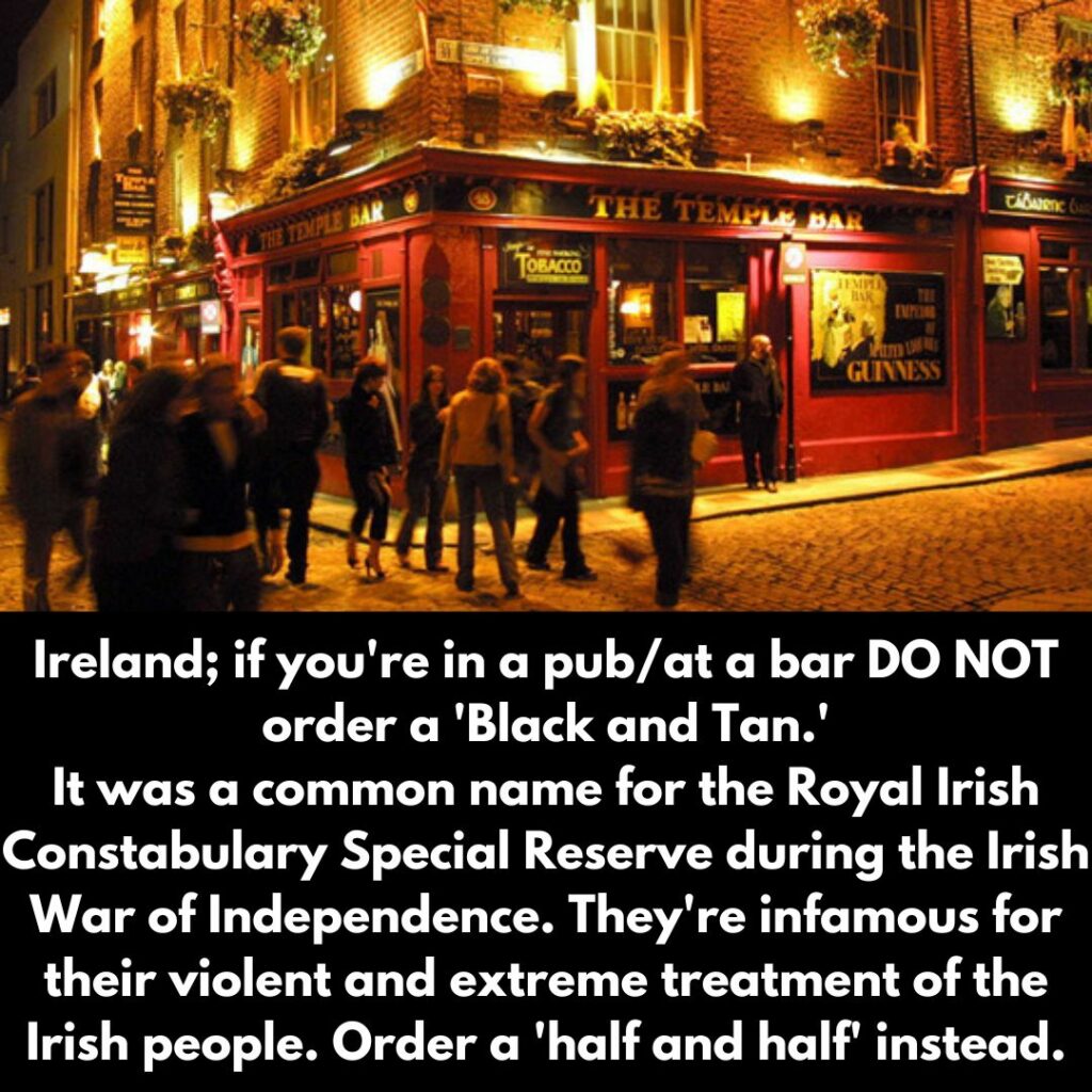 You have things like the Coole Swan, Orchard Thieves, and the list foes on. But if you’re wanting a Black and Tan, ask for a Half and Half instead to save yourself the trouble. A pub is just not the place to be bringing up those old painful memories.