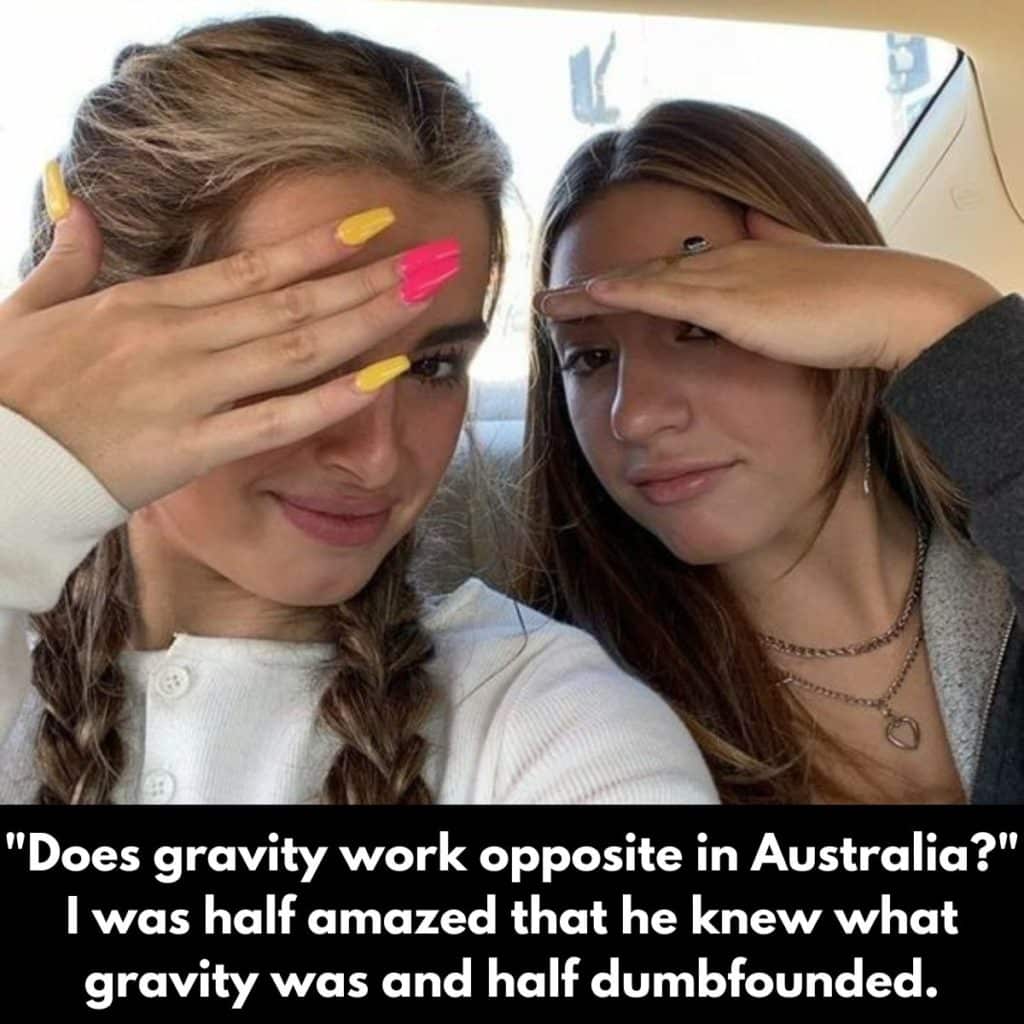 Another story about an American saying something ridiculous to an Australian, and another situation where I am surprised to find myself defending the American, at least a little bit. Obviously, gravity does not work the opposite in Australia, and I imagine the American knew that, because surely he wasn’t thinking that Australians have to tether themselves to the ground to keep from floating up into the sky.