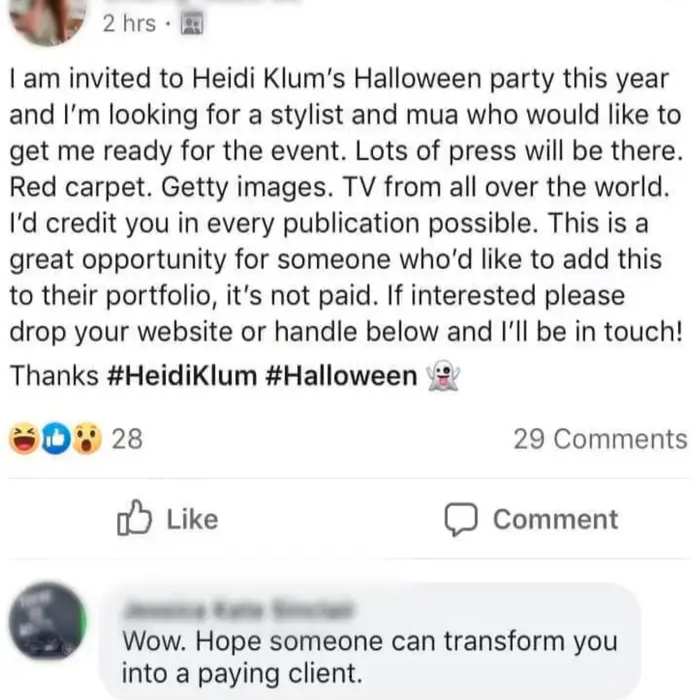 We get it, you’re invited to Heidi Klum’s famous Halloween party, good for you. But that doesn’t give you the right to stick your nose so high up in the air and demand that complete strangers take the opportunity to work on your hair and makeup all day without getting paid for it.