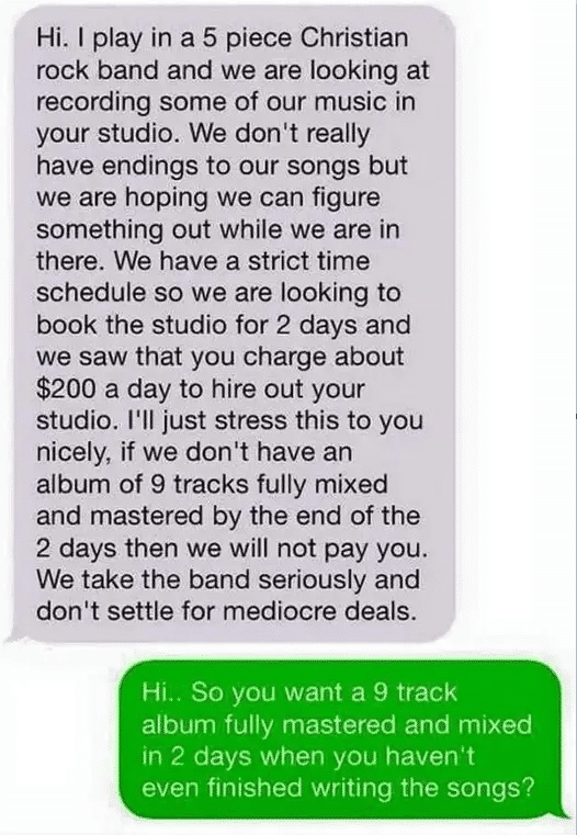 There are so many things wrong with this situation. In what world would anyone be able to finish a 9 track album in 2 days when they haven’t even figured out the endings to each song? Surely they know that editing music takes a long time… Stop wasting everyone’s time.