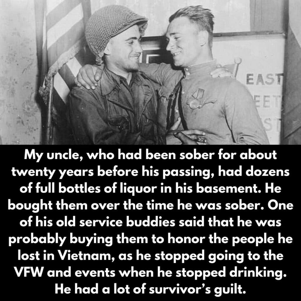 These veterans carry not only the physical scars but also the invisible wounds of war, enduring a lifelong struggle to make sense of their experiences and find solace. It sounds like this person’s uncle was carrying a lot of guilt and shame, and one way to deal with these emotions was alcohol. Even after he got sober, he used alcohol to honor the fallen troops.